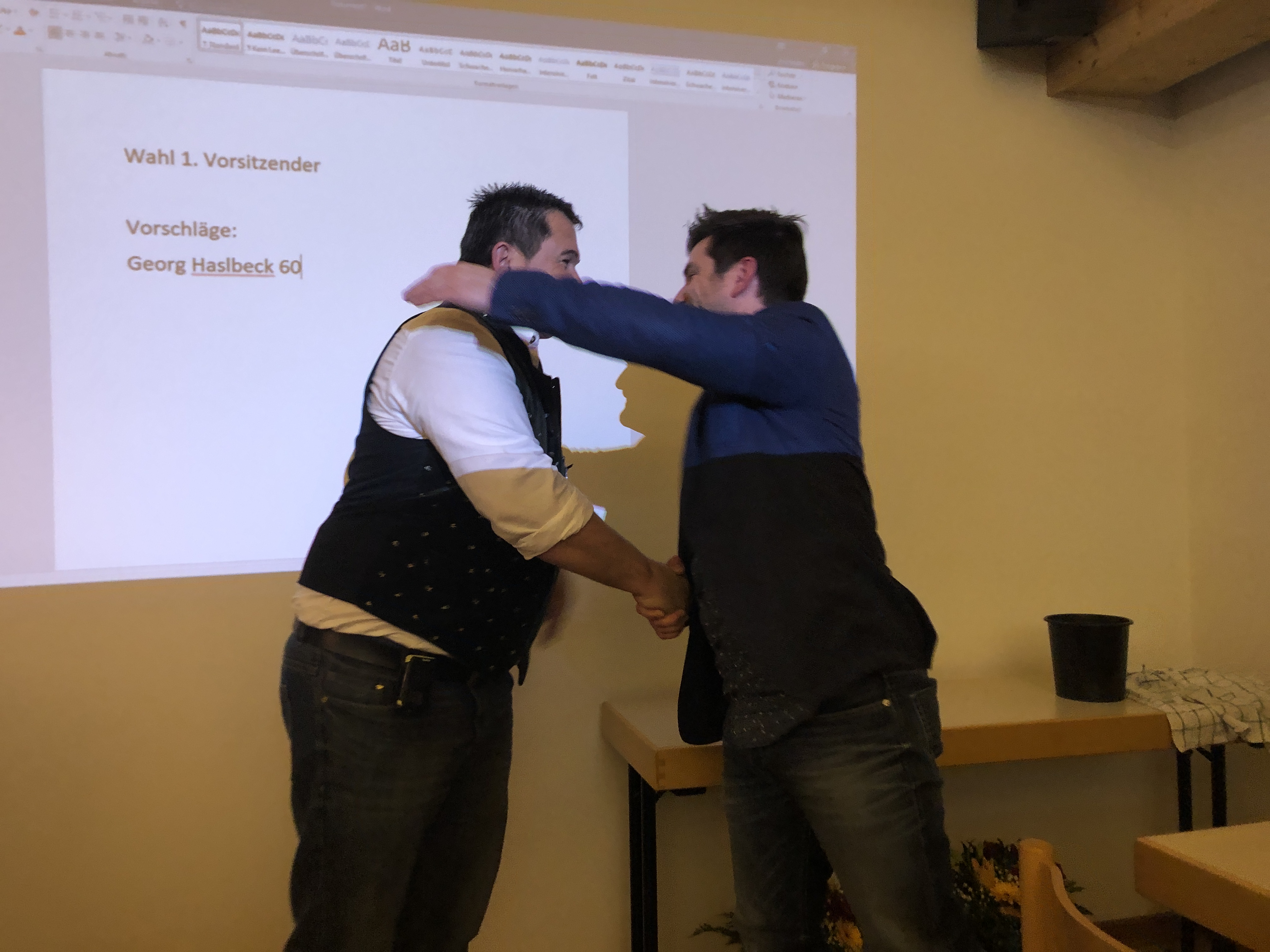 Bei der Wahl zum 1. Vereinsvorstand durfte schon ab 12 Jahren gewählt werden, 69 Wahlberechtigte waren anwesend. Georg Haslbeck war der einzige Kandidat. “Schorschi, des werd knapp”, rief Bgm. Monn. Schorschi bekam 60 von 67 Stimmen bei 7 Enthaltungen.