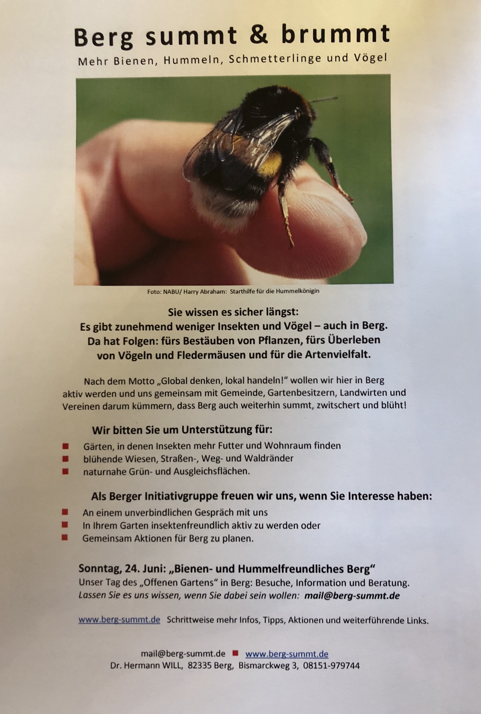 Susanne Polewski aus Allmannshausen. Sie beklagt das Artensterben vom Nashorn bis zur Biene. Sie hat mit einer Imkerin und Freunden eine Initiative gegründet, die heißt: “Berg summt”. Sie möchte die Straßenränder – wie in anderen Gemeinden – nicht nur begrünen, sondern auch beblumen: einen Antrag im Gemeinderat gab es dazu bereits … die zweite Bitte geht an alle anwesenden Gartenbesitzer: bitte Blumen pflanzen und veröffentlichen. Einen Handzettel dazu gab es auch. Frage an Herrn Monn: Was ist geplant? – Großer Applaus.