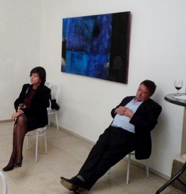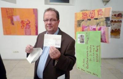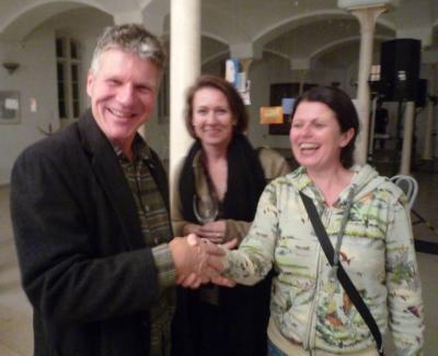 Der aktuelle Träger des QUH-Ateliertage-Preises, Roman Wörndl, freute sich über seinen Preis (einen feuchten Händedruck von Elke Link, nachträglich überreicht)