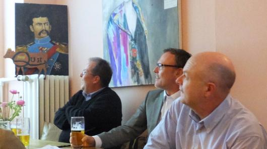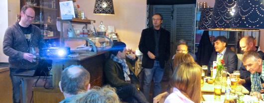 Jeder wie er kann: QUH “Hirte” und Versammlungsleiter Weibrecht (links im Bild, Liste Platz 7) organisiert, QUH-Chef Ammer (stehend Liste Platz 3) redet