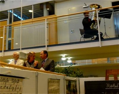 Bei der Eröffnung: Joachim Wenzel vom Berger Archiv, Friederike Hellerer vom Herrschinger Archiv und Schirmherr Landrat Karl Roth über dem Museumszimmer aus Aufkirchen und unter der Bigband des LSH Kempfenhausen