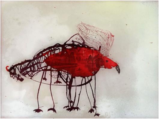 Juschi Bannaski, “Der zwölffüssige, rote Flugselbstzweifler”, Öl Hinterglas