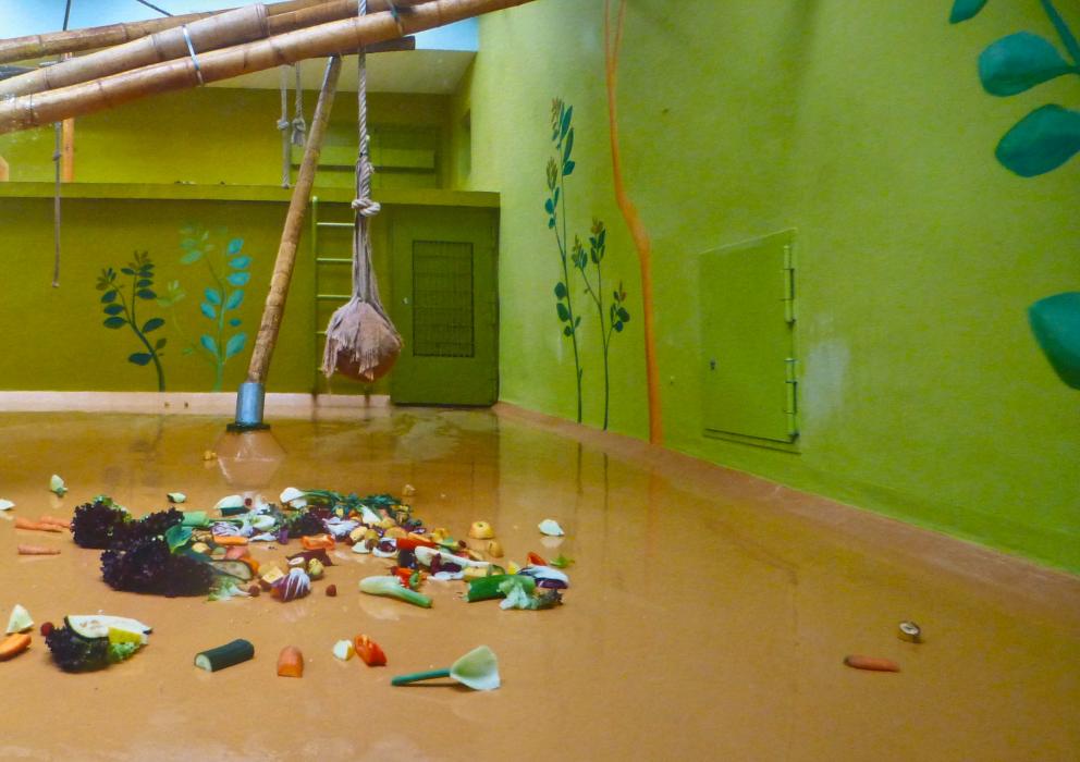 Allein schon den Preis wert ist das geniale Photo “Affenhaus München” (oben ein Ausschnitt). Huber photographierte es kurz vor der Fütterung und frischgeputzt, aber ohne Affen (Bild bitte unbedingt zum Vergrößern anklicken und das bunte Gemüse am Boden bewundern!)
