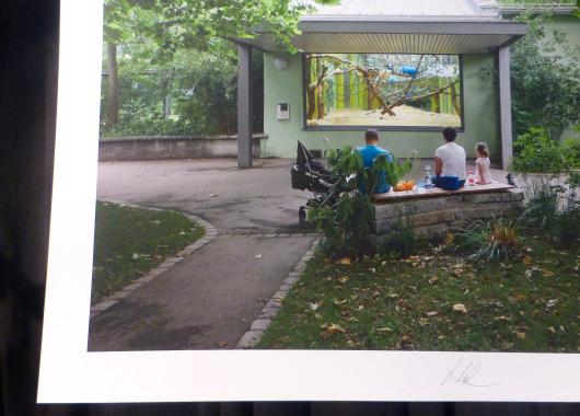 Und wer bekommt nun den alljährlich von der QUH verliehenen “Preis der Ateliertage”? – Eindeutig der Photograph Andreas Huber aus Aufhausen, der sich dem Thema “Tiere” besonders pfiffig näherte: Seine Photos aus dem Zoo, auf denen gerade keine Tiere, sondern nur Menschen oder deren Wirken zu sehen sind, sind ebenso anrührend wie ästhetisch.