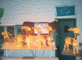 Jetzt hat Waltraud einen Ehrenplatz bekommen: Vor dem Cafe Frühtau darf sie einträchtig mit einer kleinen Herde Rentiere einen Weihnachtssschlitten ziehen. Una bella figura!