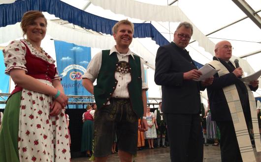 Maitanz und Segnung waren ins Zelt verlegt worden, was zwar ein paar Sitzplätze kostete, aber für alle Beteiligten angenehmer war. Obermadl Theresa Demmler und Oberbursch Johannes Oberrieder begrüßten die Gäste, bedankten sich bei allen Helfern, verteilten Wein und Blumensträuße, dann konnten Pater Josef Posch und Pfarrer Johannes Habdank zur Segnung übergehen ( /?p=471/ ).