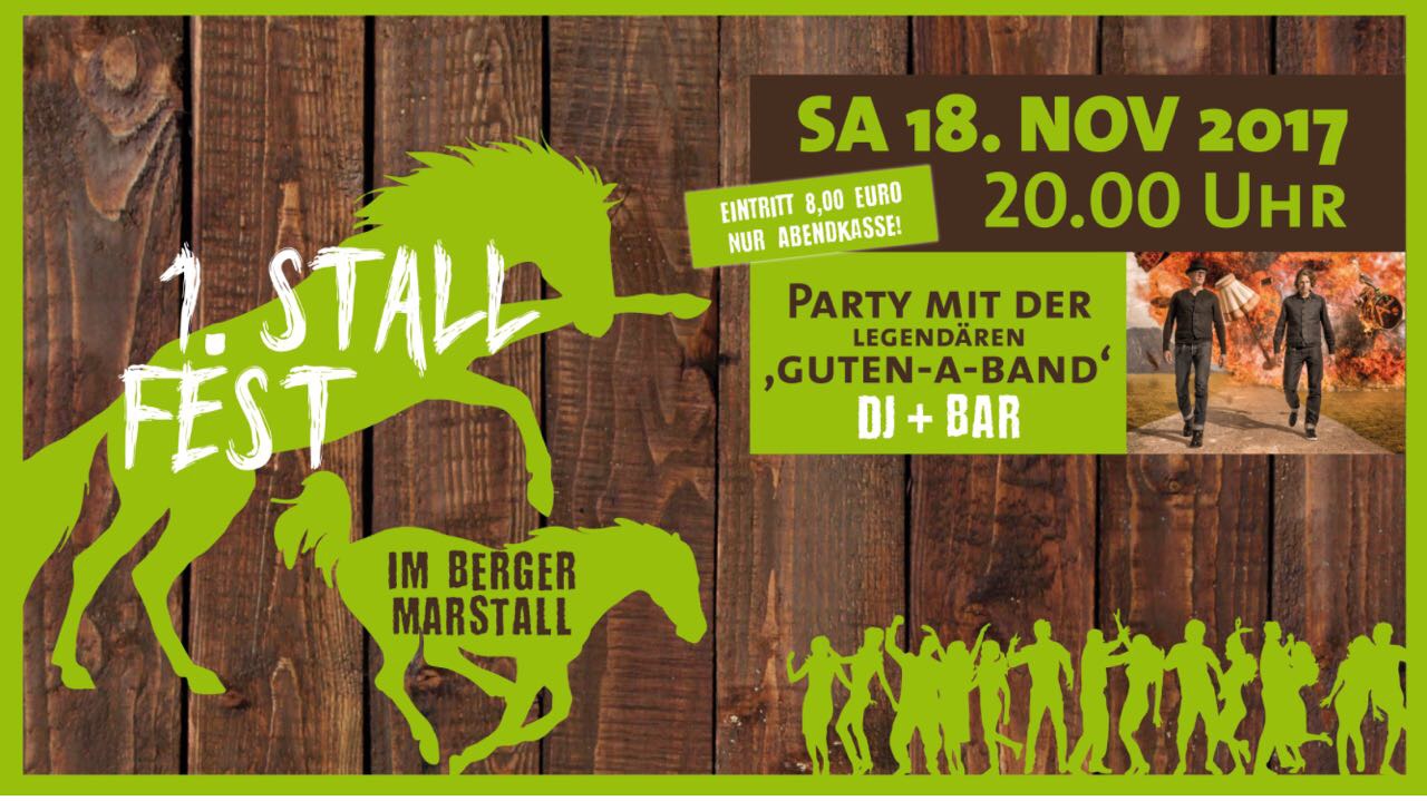 Der Berger Marstall hat schon einige legendäre Feste gesehen, heute könnte ein weiteres dazu kommen: Fünf Bergerinnen und ein Berger veranstalten heute im ehemaligen Pferdestall von König Ludwig II. das 1. Stallfest; für Musik, Getränke und gepulltes Pork ist gesorgt: ganze Singlevereine haben sich bereits angesagt. Und je mehr man feiert, desto reiner ist das Gewissen: der Erlös des Festes kommt voll und ganz der Jugendarbeit des MTV Berg zugute.