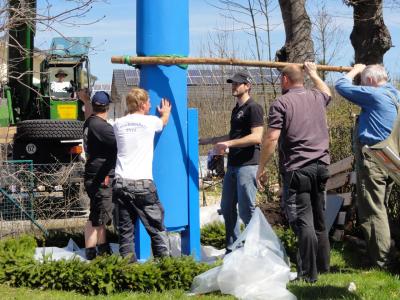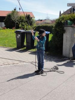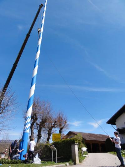 Nun war wieder Handarbeit gefragt. Der Baum muss genau ausgerichtet werden und darf unten den Boden nicht berühren, damit er nicht fault. Lässig am Seil: Tim Lindner als “Maibaumhalter”.