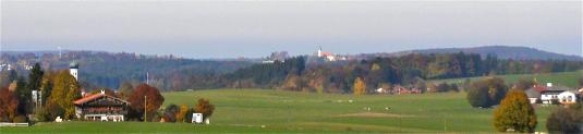 Links das Rad des Windkraftpioniers, in der Mitte Aufkirchen, rechts der Höhenzug der Wadlhauser Gräben