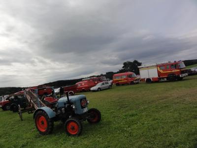 Der Parkplatz ist schon ziemlich voll. Davor: historische Feuerwehrfahrzeuge