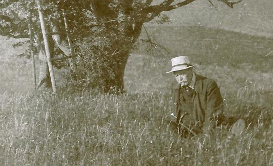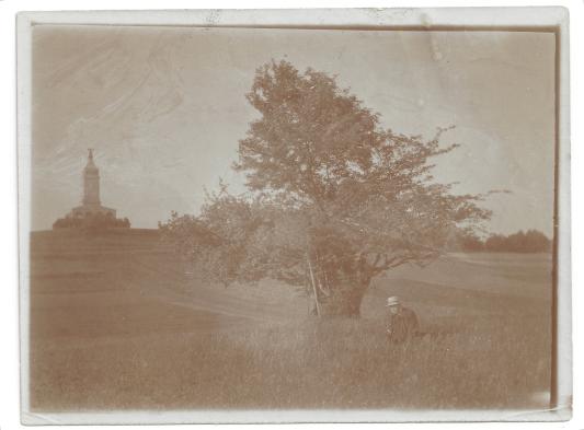 Unterhalb des Denkmals auf freiem Feld muss dieser Dornbusch 100 Jahre Zeit gehabt haben, sich zu entfalten. Dem Herrn auf der Fotografie aus dem Berger Archiv ging es nämlich bei weitem nicht um das Monument im Hintergrund, sondern um den alten Busch, der hier fotografiert wurde, und zwar nachdem er offenbar um einiges gestutzt worden war.