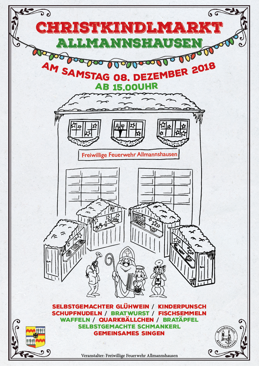 Ab 15 Uhr trifft man sich in Allmannshausen – allerdings diesmal vor dem Feuerwehrhaus, nicht vor der Kirche. Es gibt wieder den selbstgemachten Glühwein, die köstlichen Quarkbällchen, Plätzchen, Fischsemmeln und vieles mehr …
