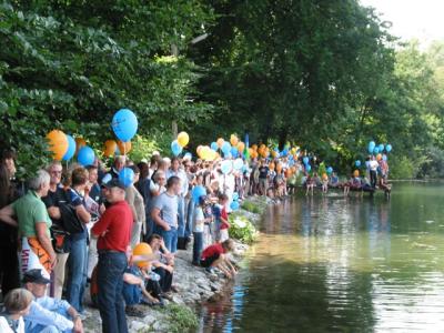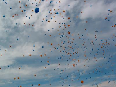 Nach der Ansprache spielte ein Bläserquartett auf einem Floß in der Mitte des Sees. Zurück auf dem Sportplatz wurden die 2000 blauen und orangenen Ballons in die Luft entlassen.