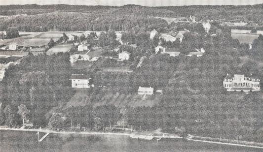 Panoramablick von Kempfenhausen auf dem Moränenwall mit der Villa de Osa (rechts), den Wadlhauser Gräben (hinten), dem Schloss (mitte) und einem weiteren unscheinbaren Häuschen (mitte)