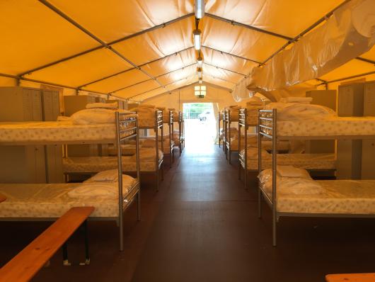 Die Zelte sind die gleichen wie in Berg. Es ist Platz für acht Stockbetten mit abschließbaren Spinden, Matratze, Bettwäsche und Handtuch. Sie besitzen eine doppelte Wand und werden über Schläuche von außen beheizt.
