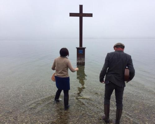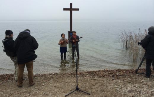Zu Füßen des Kreuzes von König Ludwig spielten die beiden dort in Gummistiefeln auf ihren Ukulelen das “König Ludwig Lied” …