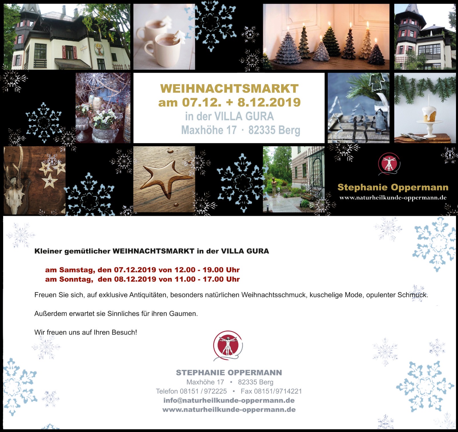 Am Samstag und am Sonntag findet schon ab Mittag bei Stephanie Oppermann in der schönen Villa Gura auf der Maxhöhe wieder der beliebte Weihnachtsmarkt statt – unter anderem mit Schmuck von Barbara Dorsch-Aumiller, Antiquitäten, Deko. Das Café Frühtau ist ebenfalls dabei.