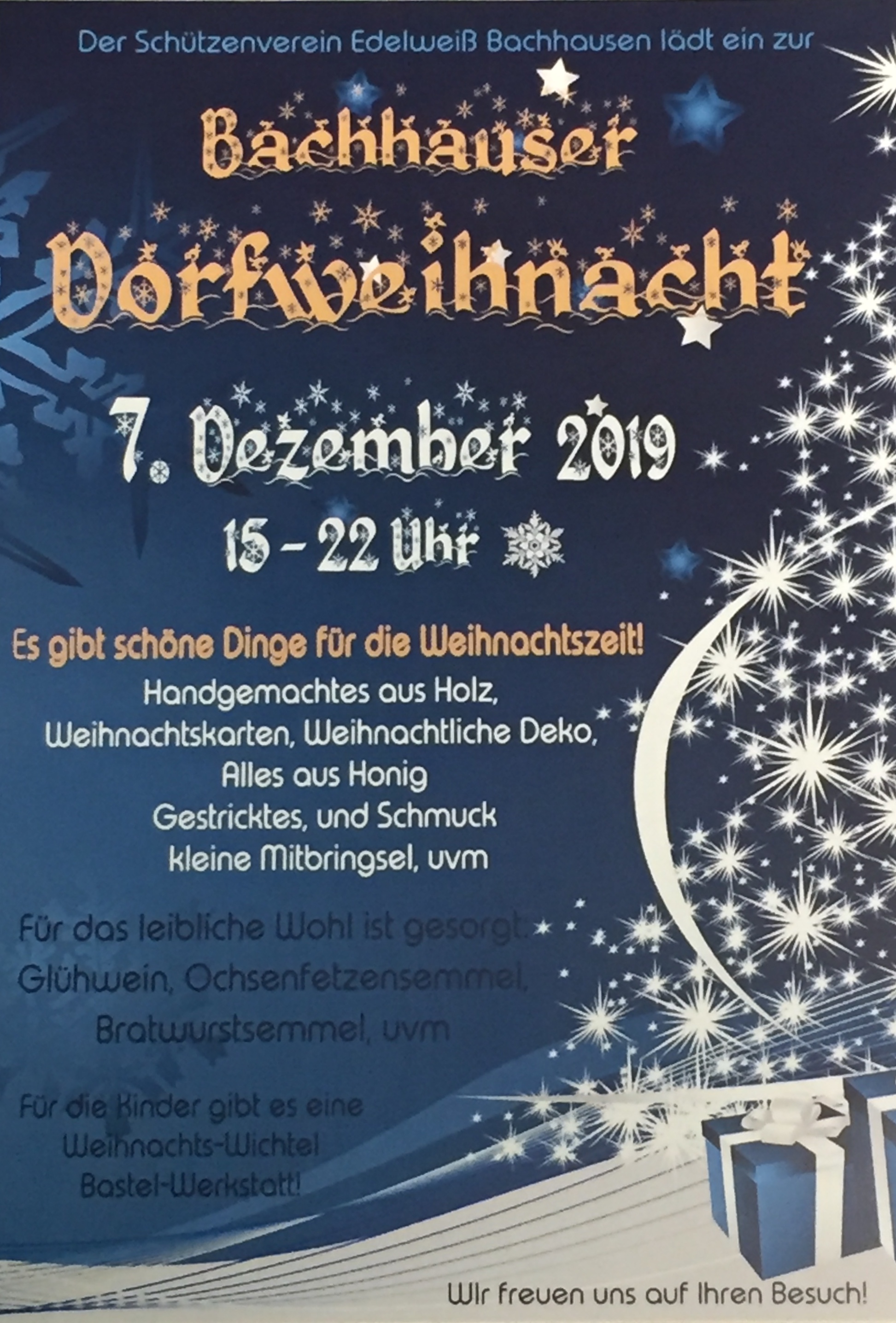 Der Schützenverein Edelweiß Bachhausen lädt auch in diesem Jahr wieder zur Dorfweihnacht, heute von 15:00 bis 22:00 Uhr. Neben Ochsenfetzensemmeln, Bratwurst und natürlich Glühwein wird allerlei Handgemachtes, Honig und Schmuck angeboten. Für Kinder ist eine Bastel-Werkstatt eingerichtet.
