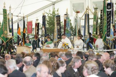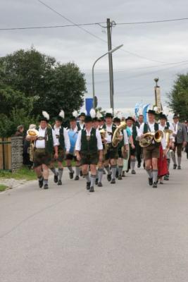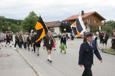 Lediglich der Feldgottesdienst wurde zu einem Zeltgottesdienst gemacht, der Umzug konnte trockenen Fußes stattfinden. Danach ging es wieder ins Zelt, das gut gefüllt war. Man empfing Gäste aus Wolfratshausen und den Patenverein aus Münsing samt Bürgermeister Grasl.