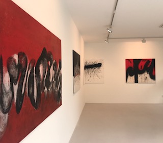 Die ausgestellten Bilder sind in Rot, Schwarz und Weiß gehalten. Manche Arbeiten sind kalligraphischer Natur, auf Papier, aber auch in Öl auf Leinwand. Unleserliche Schriftzeichen – die Bewegung der Linie als Motiv. Zum anderen zeigt Iman Mahmud Frauenporträts in Tusche.