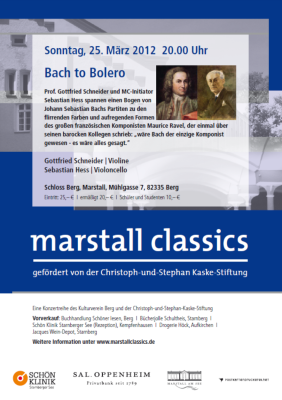 Eine weitere Folge der Serie – nein, nicht Twin Peaks, The Wire, Mike Hammer oder Sex in the City – aber ein bisschen Kultcharakter kann man marstall.classics durchaus zusprechen. Stets erfrischend moderiert von Initiator Sebastian Hess, wird bei marstall.classics jedesmal eine schöne Kombination klassischer und neuer Musik präsentiert. Diesmal allerdings spannen Sebastian Hess (Cello) und Violinist Gottfried Schneider den Bogen nicht ganz so weit: Von Bach bis Ravel führt am Sonntagabend die musikalische Reise.