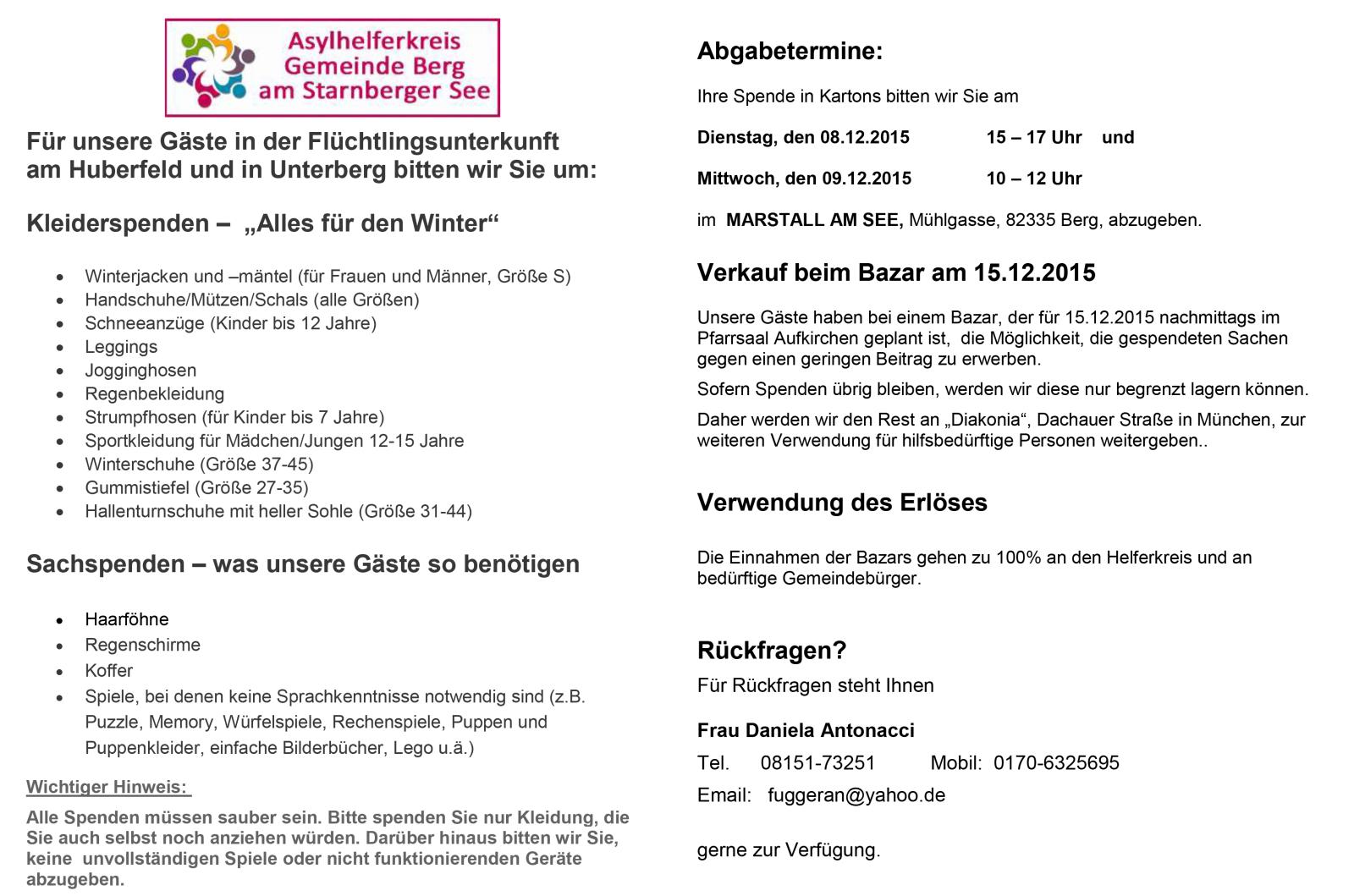 Der Helferkreis organisiert einen Bazar für unsere Gäste, die in der Zeltanlage und in Unterberg untergebracht sind. Kleider- und Sachspenden (Details siehe Flyer) können am Dienstag, den 8.12., von 15 – 17 Uhr und am Mittwoch, den 9.12., zwischen 10 und 12 Uhr am Marstall abgegeben werden.