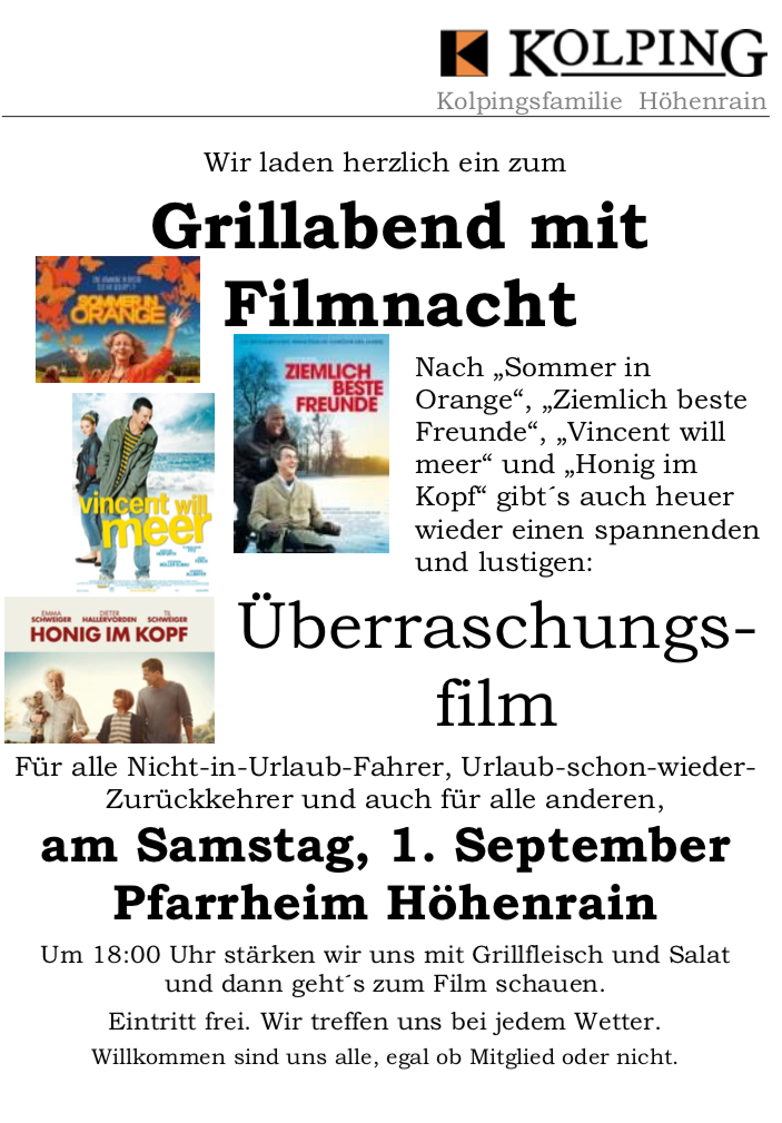 Zum 6. Mal lädt die Kolpingsfamilie Höhenrain am Samstag, den 1.September, zum Grillen mit Filmnacht ins Pfarrheim nach Höhenrain.