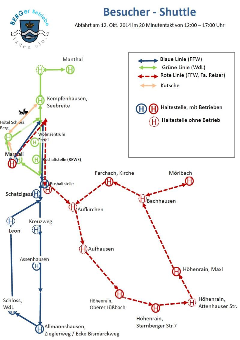 Alles ist möglich, wenn eine Gemeinde zusammenarbeitet. – Es klingt wie ein Traum! Die Gemeinde Berg bekommt öffentliche Verkehrsmittel. Vier Linien werden im 20-Minuten-Takt durch die Gemeinde fahren … alle umsonst! … Noch besser: Der Traum wird Wirklichkeit … leider nur für einen Tag. Am kommenden “Berger Betriebe laden ein”-Sonntag werden vom Marstall aus 3 Buslinien und eine Kutsche die Besucher von Ortsteil zu Ortsteil und von Betrieb zu Betrieb fahren. Und so sieht es aus das öffentliche Verkehrsnetz für Berg (das sogar Mörlbach und das Manthal anbindet! – Zum Vergrößern und Ausdrucken bitte den Plan anklicken!).
