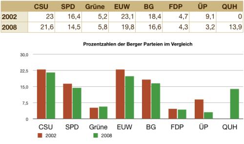 Demnach würde die CSU weiterhin 5 Sitze erhalten und die Einigkeit, die einen Sitz verliert, als stärkste Fraktion ablösen. SPD und BürgerGemeinschaft verlieren leicht, können aber ihre Sitze halten. Auch der Sitz der Grünen scheint nicht in Gefahr; die Partei kann sogar als einzige leicht hinzugewinnen. Die FDP, die schon beim letzten mal nur knapp in den Gemeinderat rutschte, muß trotz des Plakatterrors bangen, für die ÜP wird es eng.