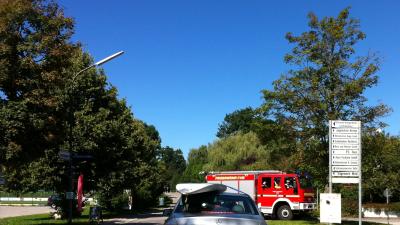 Die Autos, die sich nicht hinter den Meßfahrzeugen stauen, werden freundlich von der Feuerwehr bei ihrer Ganztagsübung aufgehalten.