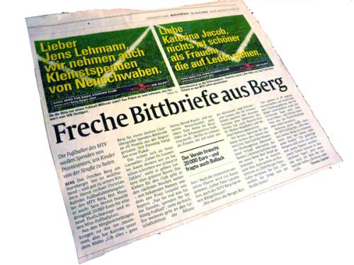 Die Plakataktion des MTV macht auch überregional Schlagzeilen: http://www.abendzeitung.de/bayern/52904. Am Wochenende berichtete die Münchner AZ über den Coup der Fußballabteilung. Leider fehlte in der Zeitung die Kontonummer. Deshalb hier nochmal. Sie lautet: 100 814 385 / BLZ 701 693 31. Auch sportlich lief – trotz der vorbereitenden Feier im adabei – alles wunderbar: