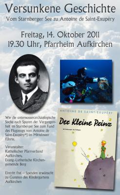 Danach, um 19:30, hält Lino von Gartzen im Pfarrheim Aufkirchen seinen Vortrag mit dem Titel “Versunkene Geschichte – vom Starnberger See zu Antoine de Saint-Exupéry” und erzählt, wie ihn die Spurensuche beim Tauchen im See bis ins Mittelmeer führte. Der Eintritt ist frei, Spenden zugunsten des Kindergartens Aufkirchen werden erbeten.