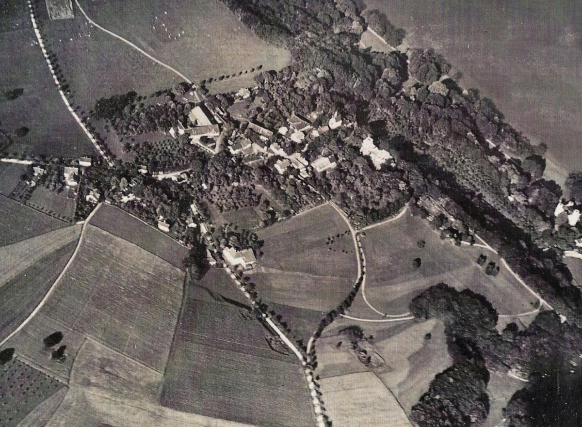 Der Weg hoch nach Aufkirchen war linksseitig von Bäumen gesäumt; die Lindenallee (mitten im Bild wie eine Perlenschnur) frisch gepflanzt. In Aufkirchen (rechts) erkennt man am Ortsrand die Schule und auf der anderen Straßenseite den Pfarrhof. Die Hänge sind noch unverbaut. Oben am Bildrand Farchach.
