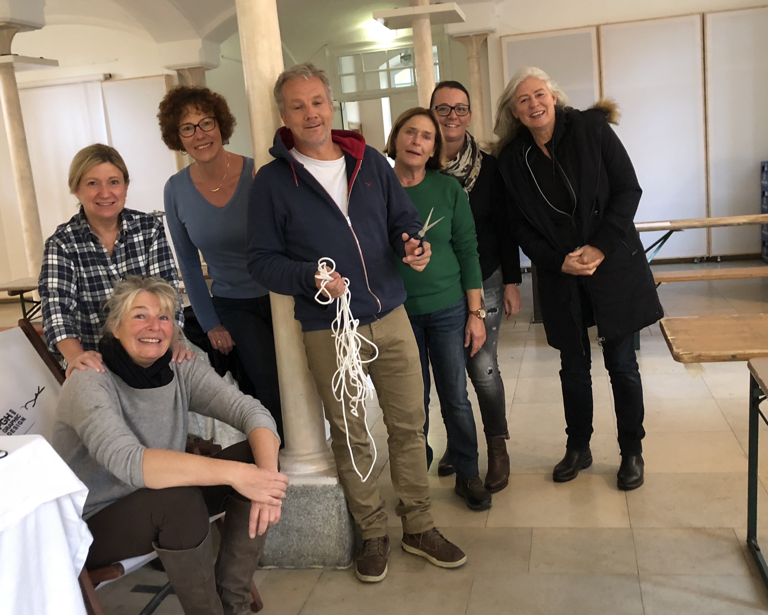 Beim Aufbau: die Grafikerinnen Lorraine Habdank und Petra Hilke, die Damen vom ÖKAP, in der Mitte Jörn Kachelriess von der Firma Yearning,und rechts Dagmar Wagner
