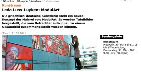 Nachdem neulich schon Lena und Lino von Gartzen so nett über die Mattscheibe liefen, strahlt der Bayerische Rundfunk heute wieder ein Porträt aus Berg aus. In der Reihe “Kunstraum” geht es um die in Kempfenhausen lebende Künstlerin Leda Luss-Luyken und ihre ModulArt. Termine: Heute, Mittwoch, 19 Uhr auf BR-alpha, Wiederholung morgen, 31.3. um 9:30 auf demselben Sender.