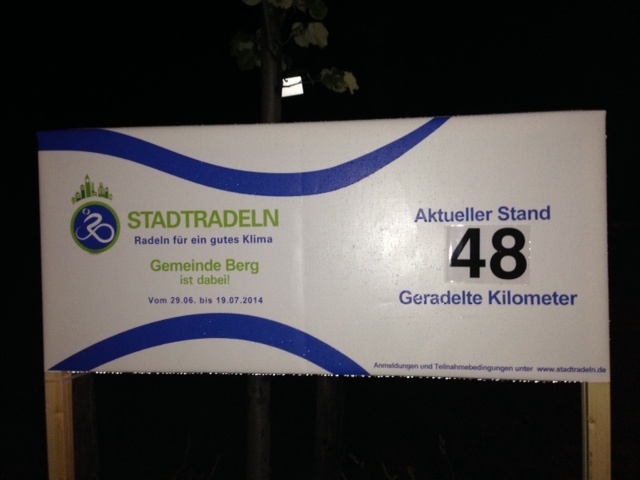 29.06.14 – Es geht los! Der Radltachometer ist postiert (am Kreisel in Fahrtrichtung Nord rechts der Straße), die ersten Kilometer wurden bereits geradelt. Und das Wetter wird auch noch besser. Bestimmt! |