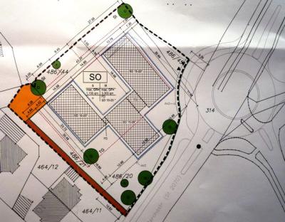 Der fertige Bebauungsplan für das “Betreute Wohnen”; rechts die kreisrunde “Seniorengefahr”, die die Häuser geradezu bedrängt