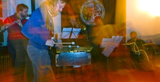 Es war wahrhaft “unerhörte” Musik jenseits der Genres. “Was war das denn jetzt für ein Stil?”, fragte so einer der verdutzten Zuhörer noch nach dem Konzert. Für Jazz gab es zu wenige Improvisationen, für Kunstmusik war das ganze zu beschwingt und melodiös und als Pop kann man ein Instrumentalensemble mit 4 Bläsern, Vibraphon (Karl Ivar Refseth) und Rhythmusgruppe samt indischem Harmonium auch schwerlich bezeichnen. “Traumhafte Melodien”, rief nach einer gut 20 minütigen Komposition eine Zuhörerin in den Raum … sie hätte aber auch genausogut “wahnsinnige Rhythmen” rufen können. Ersteres geblasen vom Bläsersatz mit Querflöte, Bassklarinette, Posaune und Micha Acher’s Trompete, letzteres von allen wechselseitig auf ihren Instrumenten und dem Holzboden getrommelt und natürlich vom wie immer famosen Andi Haberl an seinem Schlagzeug.