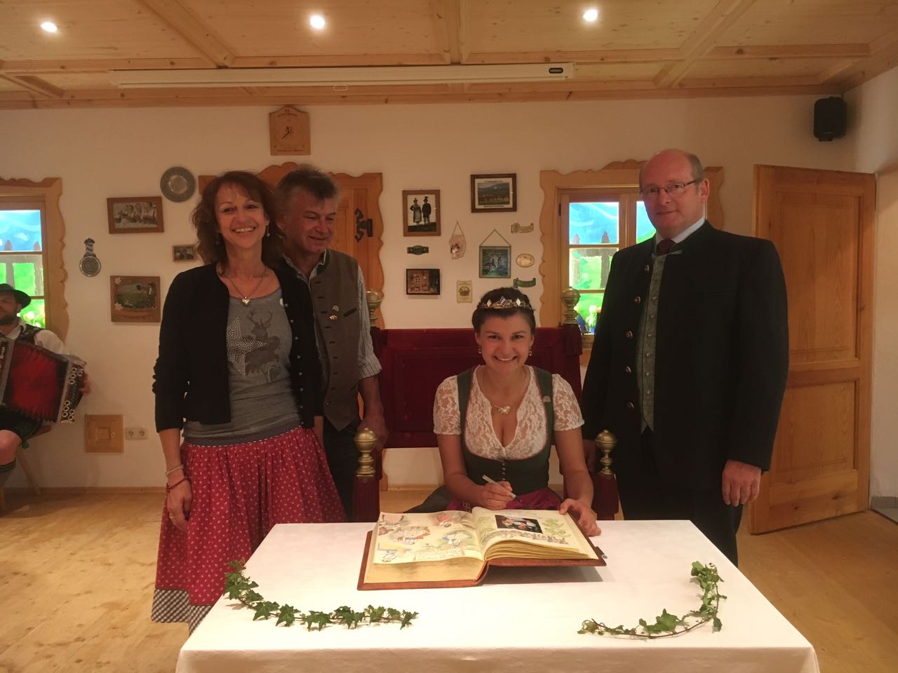 Der Bürgermeister tat so, als könne er sich das nicht erklären, – und machte sich gemeinsam mit der – noch ahnungslosen – Lena und ihren – bereits eingeweihten – Eltern auf die Suche. Über diverse Umwege gelangten sie schließlich zur Höhenrainer Dorflinde – wo Lena mit Musik und Fahnenabordnung vom Trachtenverein empfangen wurde. Nach einem Sektempfang ging es ins Trachtenvereinsheim, wo das Goldene Buch schließlich “gefunden” wurde, und Lena konnte nun die Unterschrift leisten.