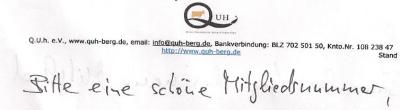 Danke, das tat gut. Besonders freut es uns auch, dass wir allein in der letzten Woche fünf (!) neue QUH-Mitglieder begrüßen durften! Herr P. Aus Allmannhausen, der uns um die schöne Mitgliedsnummer bat, bekam die #111. Herr S. aus Bachhausen brachte seinen Antrag gar persönlich vorbei. – Herzlich willkommen!