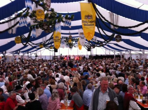 In einem rappelvollen Festzelt blasen die Bläser von “Blechschaden” den Berger Burschen und ihren begeisterten Gästen gerade den Marsch.