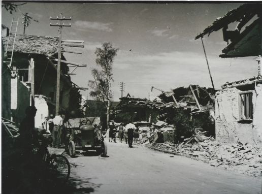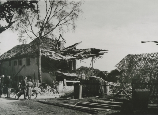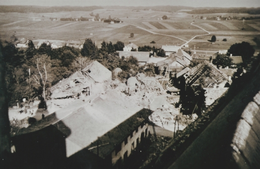Blick von der Kirche auf die zerbombte Ortsmitte