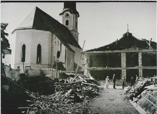 Sechs Menschen starben, darunter neben Bewohnern des Mesnerhauses drei Familienangehörige des heutigen 2. Bürgermeisters Karl Brunnhuber, dessen Vater mit Familie damals im Diesl-Anwesen wohnte. Das Diesl–Anwesen stand an der Stelle, wo sich heute der EDEKA befindet. Hier ein Blick von Süden auf das zerstörte Haus in Richtung Kloster: