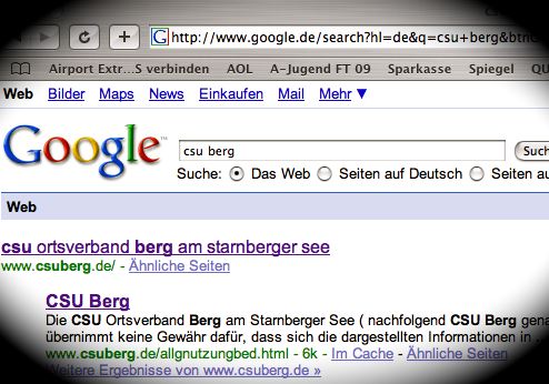 Die bloße Existenz der QUH hatte in letzter Zeit ja einige Auswirkungen auf die Gemeinde. Plötzlich wollen alle eine Skaterbahn und eine Energiewende. Zudem begann der Wahlkampf früh und heftig (was sich an den überall aufgestellten Werbeplakaten unserer Mitbewerber zeigt); letztendlich haben viele Parteien bemerkt, dass ein Internetauftritt ein nettes Mittel zur Kommunikation mit den Wählern ist. Selbst Bewohner von Höhenrain fordern inzwischen einen schnellen Internetzugang, den es dort immer noch nicht gibt. Auch die CSU, die ihre Internetseite in letzter Zeit so vergessen hatte, dass dort für jahrealte Termine Werbung gemacht wurde, wirbt am Ortseingang von Berg jetzt mit ihrer Internetseite. Ich habe den Selbstversuch gewagt. In Google gebe ich die Schlagworte “CSU” und “Berg” ein. Google zeigt mir daraufhin stolz zwei Seiten:
