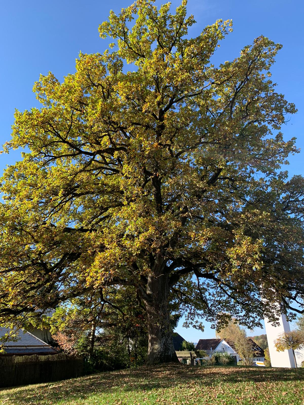 Unser erster Baum ist einer der wohlhabendsten des Erdballs. Besitzt er doch in Oberberg, einer bekanntermaßen mehr als noblen Gegend, ein eigenes Grundstück. Zumindest sagt Pfarrer Habdank, der gegenüber wohnt, diese Eiche gegenüber des Katarina-von-Bora-Hauses sei im Grundbuch eingetragen. Das bewahrt den Baum wahrscheinlich vor dem Schicksal vieler Artgenossen, die derzeit Spekulationsobjekten mit Thujenhecken weichen müssen.