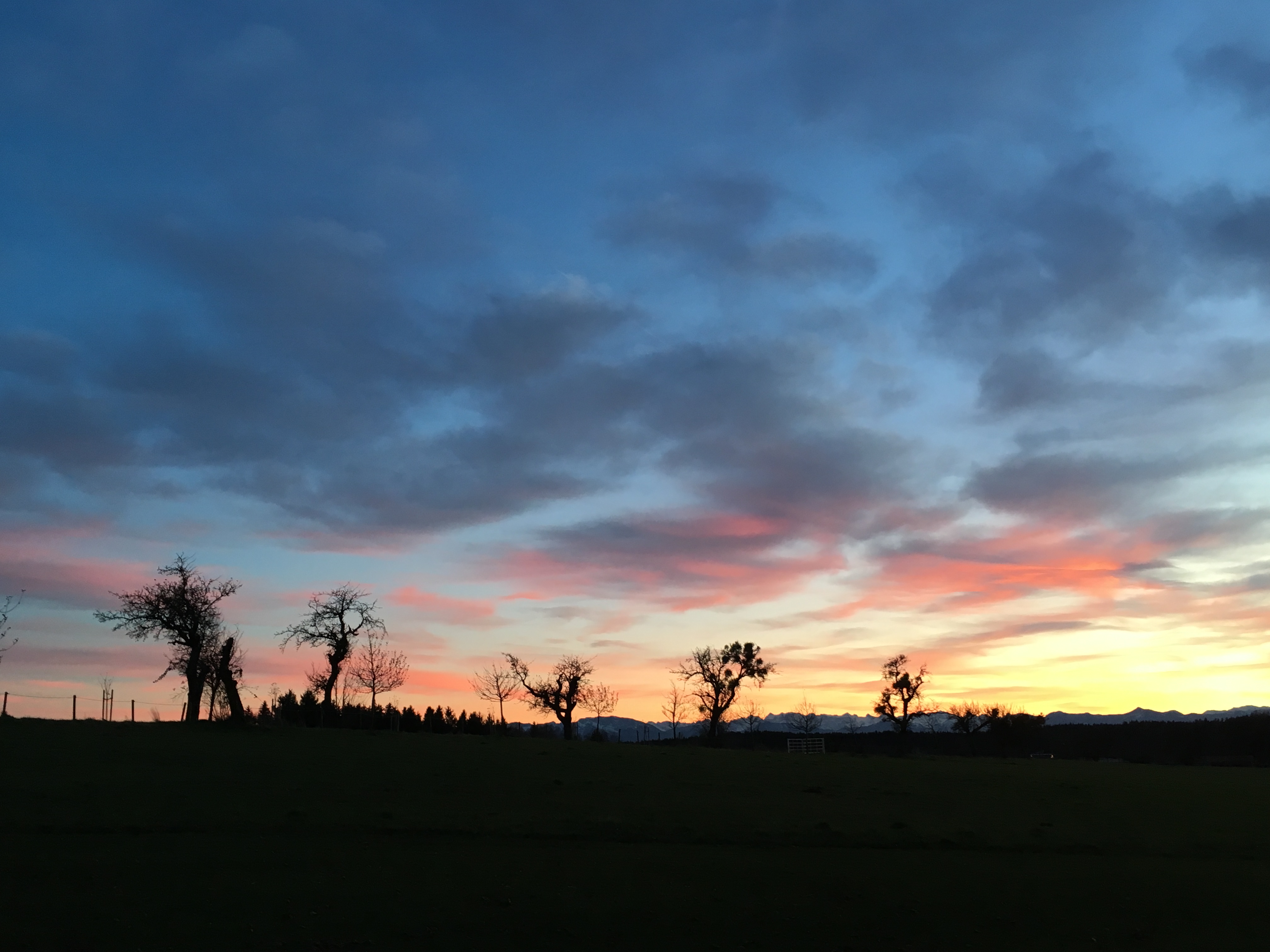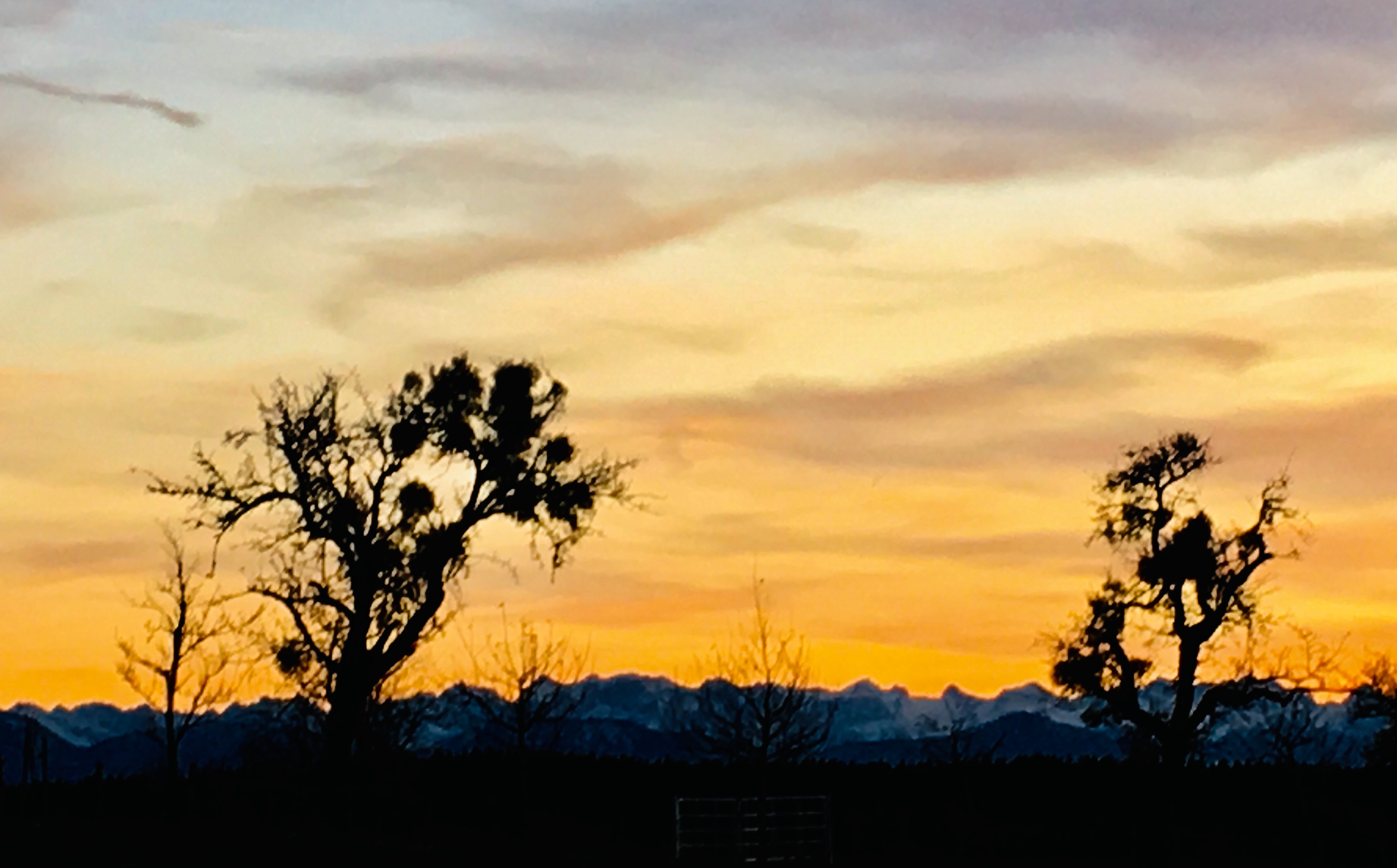 Misteln auf Äpfelbäumen vor Alpen-Panorama