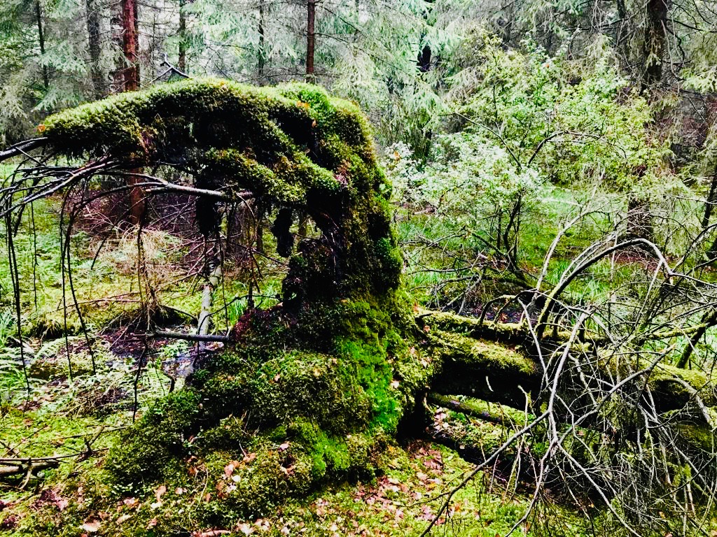 Totholz ist allerdings nicht nur ein idealer Lebensraum für Moose, sondern auch für Insekten (nicht nur für schädliche wie den Borkenkäfer). Pilze und neue Pflanzen lieben absterbendes Holz. Zumindest hat sich in unserem Fall zwischen all dem Moos und der Monokultur im Hintergrund des Bildes auch ein Laubbaum angesiedelt.