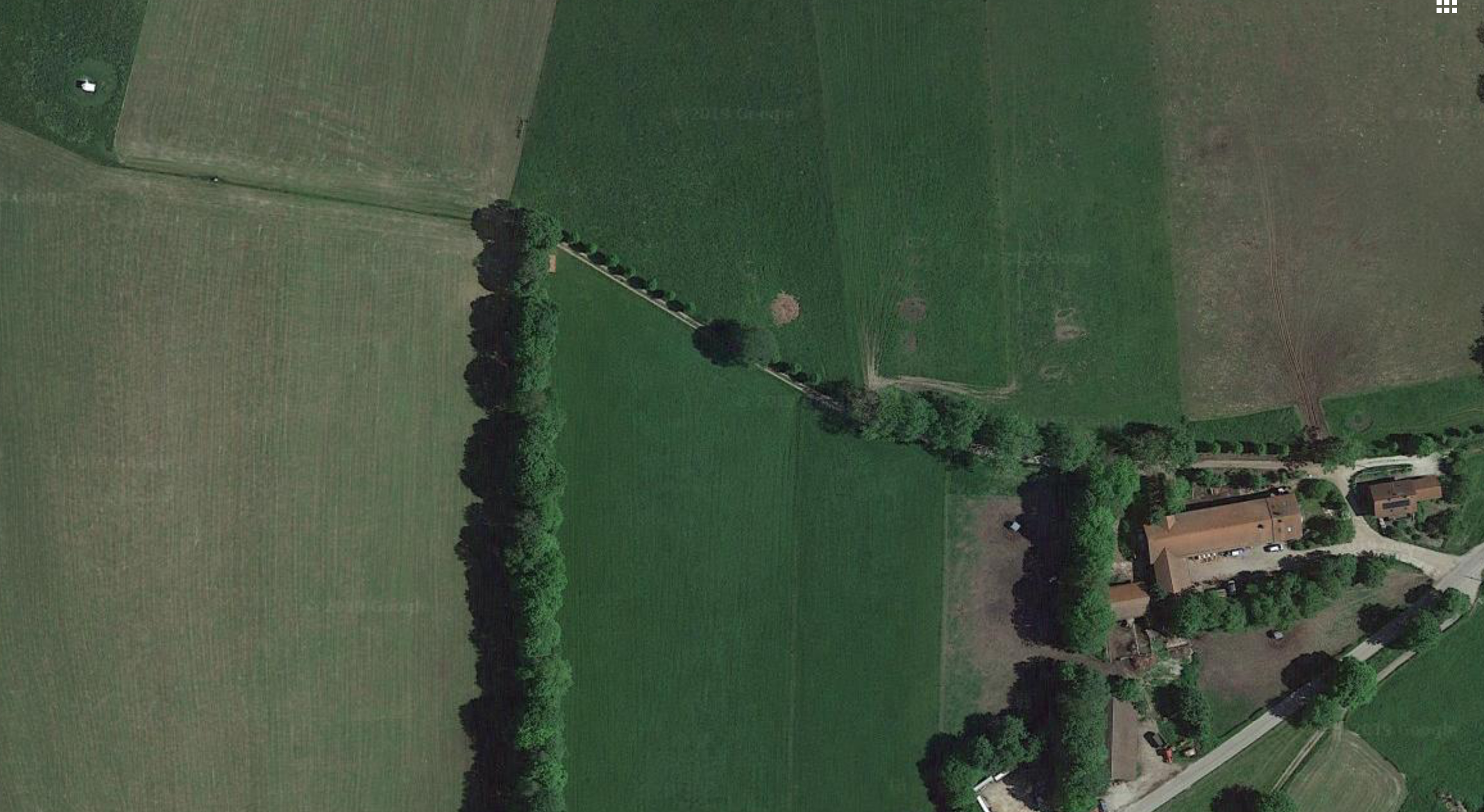 Weit hinter der Allee steht unzugänglich auf einer Weide eine kleine Kapelle, zu der die Allee vielleicht einmal geführt hat. Selbst der Weg dorthin ist heute unter Weiden verschüttet. Niemand kann zu ihr. Gerade in diesem Fall ist der Blick aus dem All auf unsere Berger Bäumchen besonders aufschlussreich. Sie finden den Blick aus dem Weltraum auf Aufhauser Eschen-Allee hier: