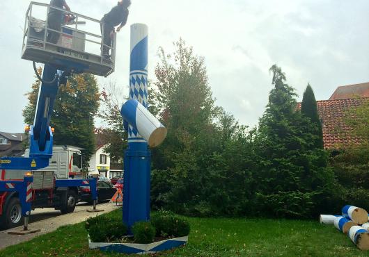 das höchste Bauwerk der ganzen Gemeinde, der Maibaum, mußte wegen Auflagen von Landratsamt und TÜV nach vier Jahren turnusmäßig gefällt werden. Der Baum selbst hat ein reiche, aber nicht unbedingt “ruhmreiche” Geschichte: erst schafften es die Aufkirchner 2010 nicht, eine Maifeier zu veranstalten. Dann wurde ihnen von den Germeringern auch noch der 32 m hohe Baum, der in Berg gelagert worden war, geklaut: im Blog findet sich die peinliche Geschichte von Diebstahl und Auslösung hier: