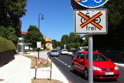 Mir scheint, hier in Berg wollte man die eierlegende Wollmilchsau: schöne Fußwege auf beiden Seiten, genügend Parkplätze, Bäume, eine Staatsstraße mit Mindestbreiten und dann irgendwie auch noch das Zukunftskonzept für Radler – und da der Platz nicht mehr wird, werden die Bausteine eben kleiner/schmaler.